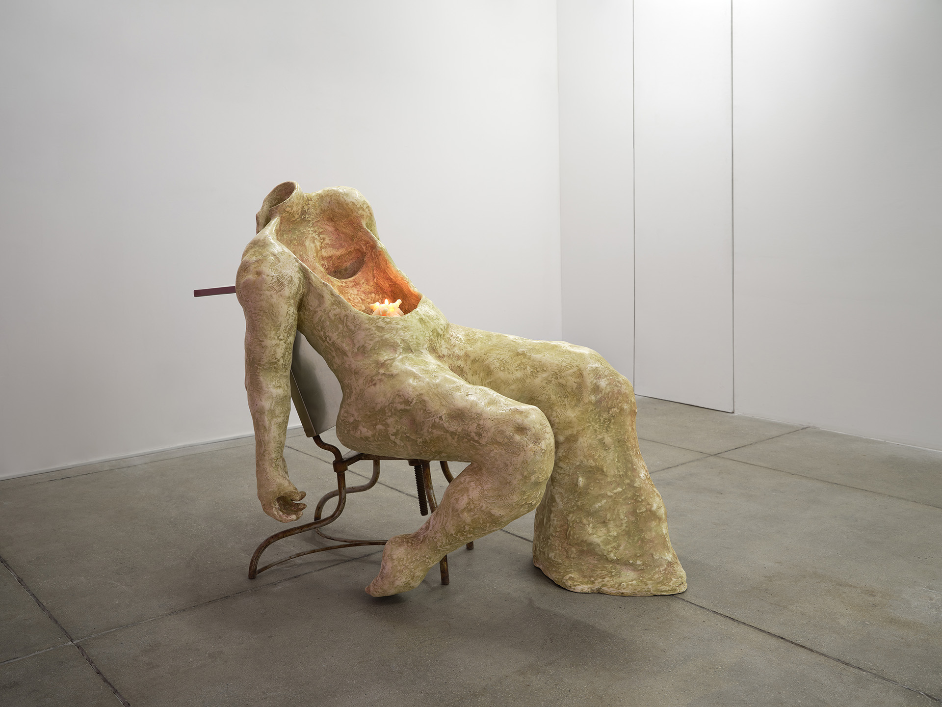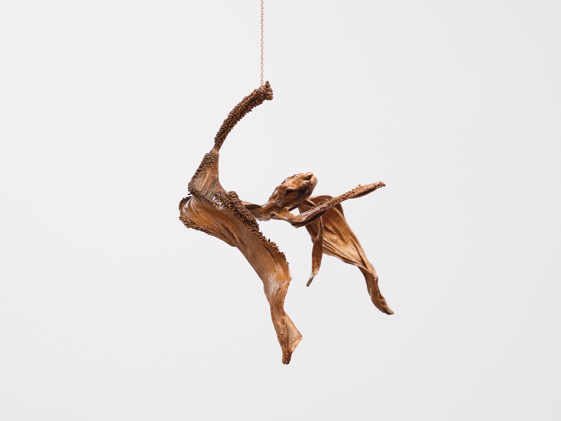 The sculptural actors here insist upon an individualized emotional fertility. There are rich emotional worlds inside these characters (Ask of Voids) that are insisted on but their interiority is vulnerable, at the bounds of control. At times this is rendered literally with young green shoots held within. Floral bounty enrobed in metal.