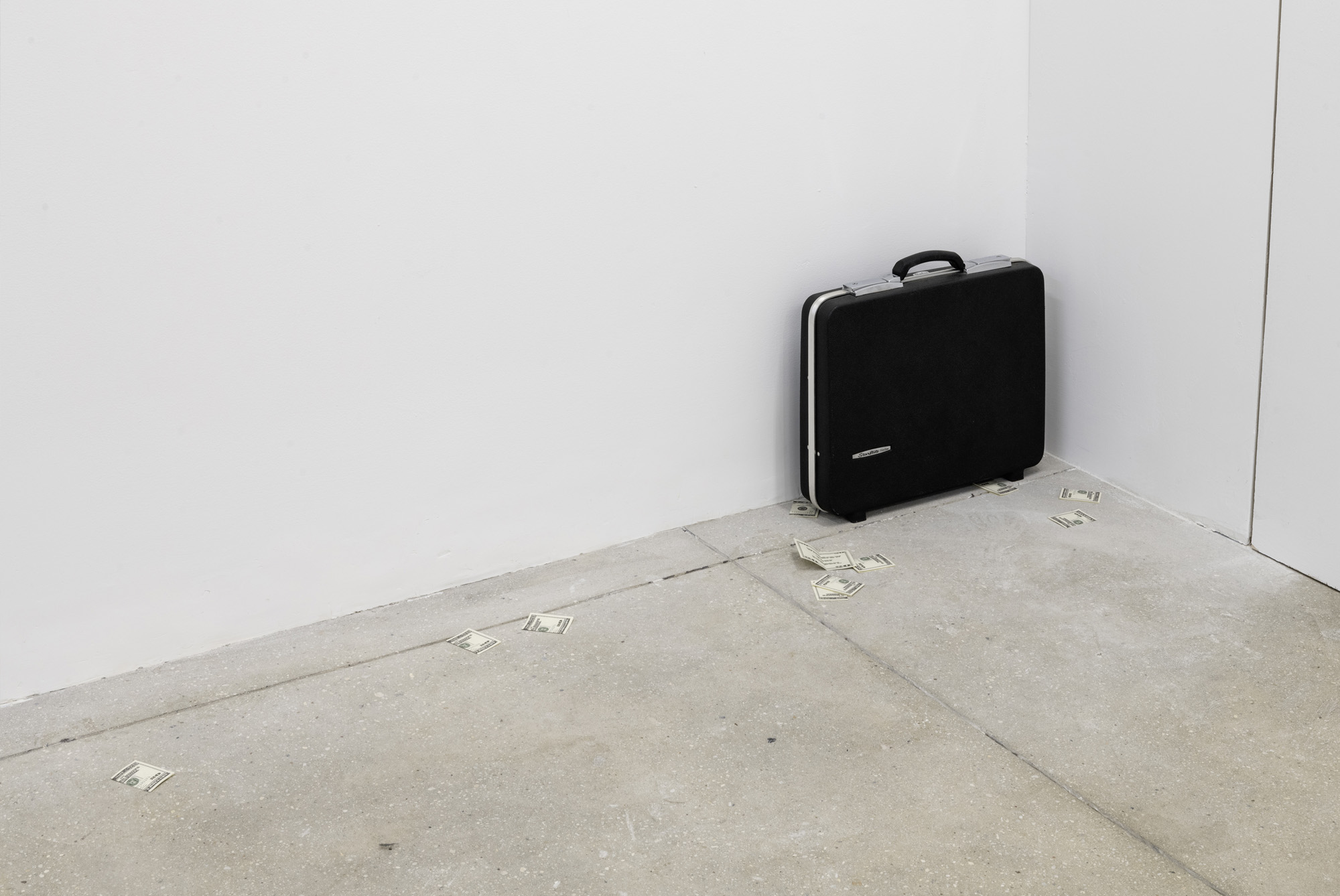 4. Peter Hoffmeister’s Withdraw Your Support (2017–ongoing) extends from his 2017 (Bill)board commission, a large-scale public artwork featuring a distorted scan of the White House on the reverse of the American twenty-dollar bill. The work consists of a 1960s-style briefcase filled with “sizzle cards” that will be taken out intermittently and offered to visitors for scattering. “Sizzle cards” are a guerilla street advertising technique that draws attention to itself by looking like a folded twenty-dollar bill that has been dropped. Unfolded, the fake bill might have read WE BUY GOLD to promote a mom-n-pop pawn shop, for example. In its place, the artist has printed the call to action WITHDRAW YOUR SUPPORT. Contrasting with campaigns around voting and participation, this messaging advocates its alternative: the use of purchasing power to boycott or withdraw.